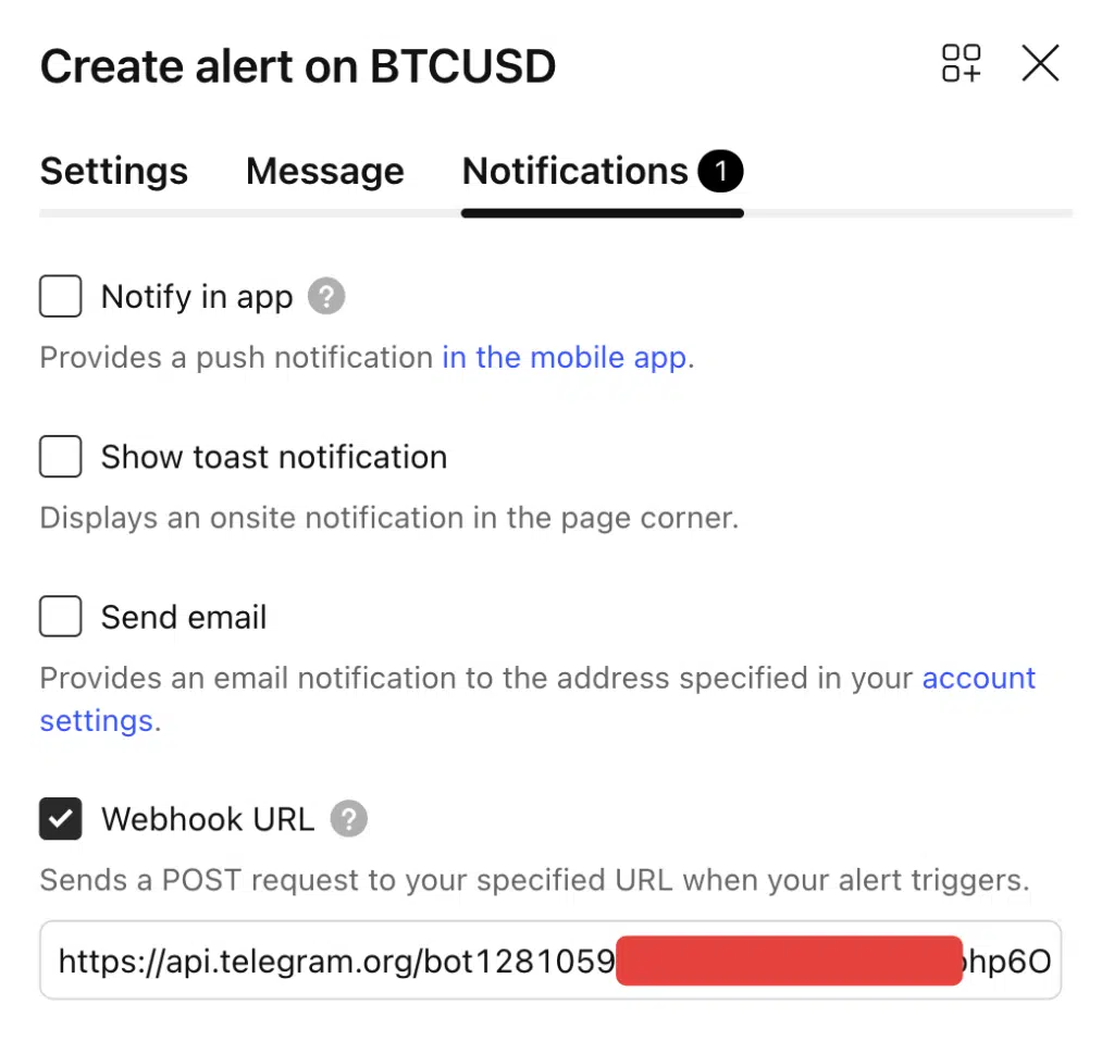 Paste this URL into the Webhook URL field in TradingView. Your settings should look something like that: