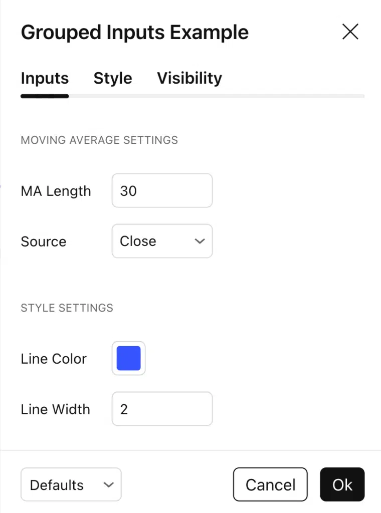 An input group allows you to visually organize related inputs together inside the indicator’s settings window.